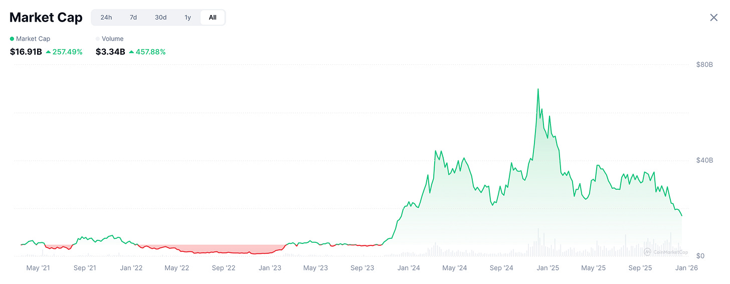AI-related cryptocurrencies, mainly based on Ethereum, its layer 2 chains and Solana, hit a record-high $69B market cap in early 2025. That market cap is now around $16B as the sector fizzled along with the rest of crypto. But it will come back - it’s something to keep an eye on, because both crypto and AI aren’t going anywhere.