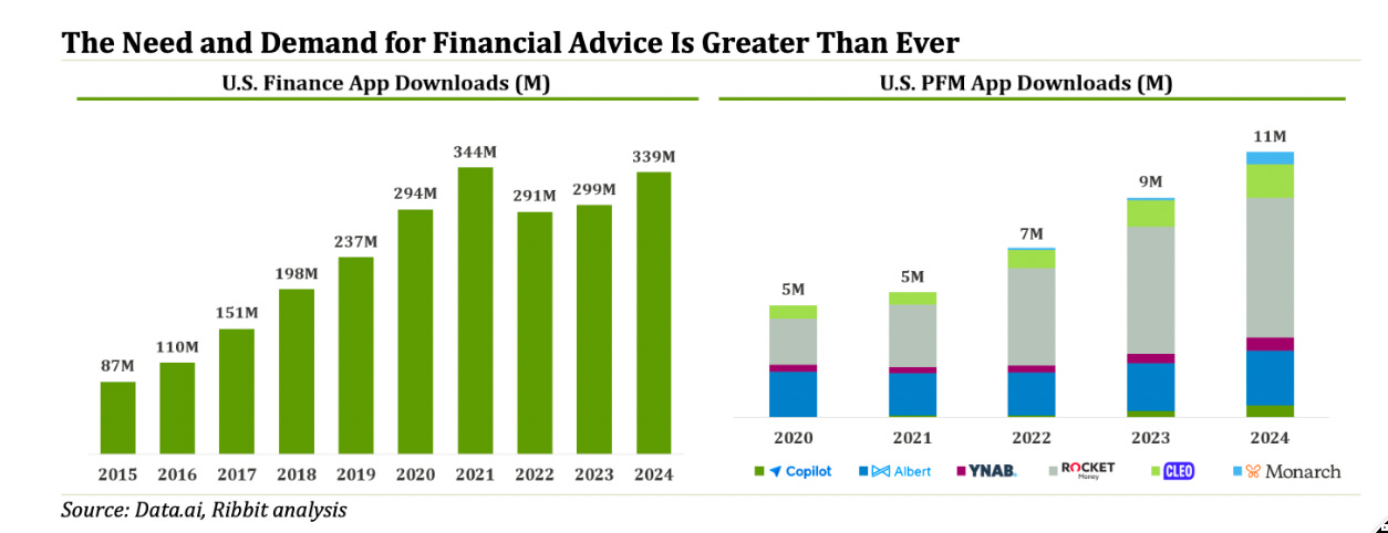 AI agents in the future will readily take cryptocurrencies from humans as payment to do things like financial analysis and trading. Ribbit Capital’s report noted over 330M financial app downloads in the U.S. for 2024, 11M of which were in personal financial management.