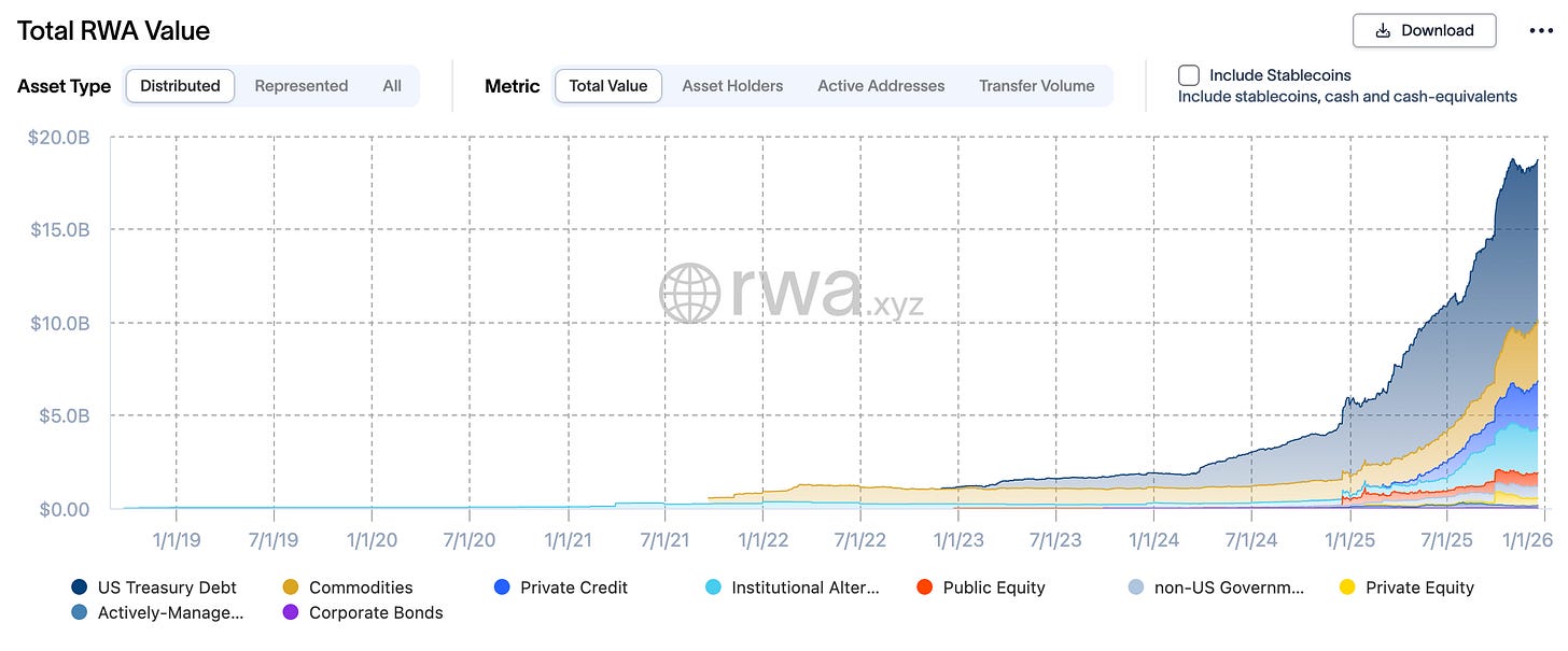As AI agents take on tasks like financial advice, tokenized activity will increase as markets begin a slow march onchain. There’s currently a rush for assets to be placed on blockchains - RWA.xyz pegs that value currently around $18B. Tokenization can unlock brand-new markets, and it's probably going to be unleashed on previously closed-off value.